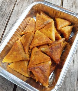 Triangle frit, réalisé à partir de feuille de brick, garni d’une farce au bœuf haché (viande 100% bœuf), persil & épices du monde !