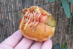 Pain brioché moelleux fait maison, mini saucisse, ketchup, moutarde, rondelles de cornichons pickles & oignons frits !