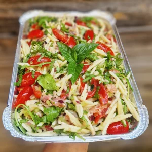 - Elle se compose de pâtes, de feuilles de roquette, de jambon Serrano, de concombre, d’oignons blancs, de tomates cerises, de basilic frais & d’une délicieuse sauce vinaigrette faite maison !